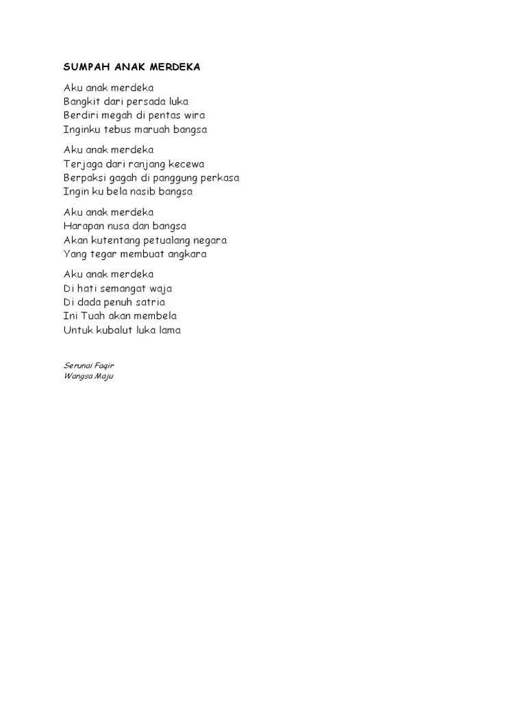 Anak Merdeka Sajak Sumpah Generasi Merdeka : Sajak Sajak Kemerdekaan Otosection. Puisi, esai, cerpen, film, drama, lagu, musik, talkshow televisi, siaran radio, seminar, … Muhammad ainun nadjib atau biasa dikenal emha ainun nadjib atau cak nun atau mbah nun (lahir di jombang, jawa timur, 27 mei 1953; Jan 05, 2020 · sedarlah wahai anak bangsa baiki diri hiasi peribadi tanamkan rasa cinta pada kebersihan agar sungai, laut, dan tanah tersenyum tiada pencemaran kauberikan harapan kauberikan masa depan agar generasi hari muka tidak merana akibat generasi hari ini yang penuh leka. "huh, orang lagi asyik belajar. Suara itu amat dikenalnya dan sosok tubuh yang gemuk pendek itu juga tak asing baginya. Baca versi flipbook dari nota komsas tingkatan 4. Bilang saja maaf, tidak ada uang kecil.