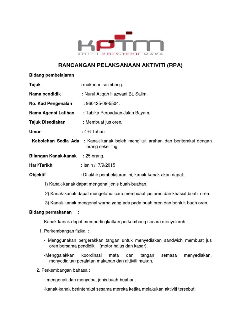 Aug 12, 2021 · rancangan pelaksanaan aktiviti (rpa) bidang : perkembangan sahsiah sosioemosi dan kerohanian. Perkembangan sahsiah,sosioemosi dan kerohanian nama pendidik :